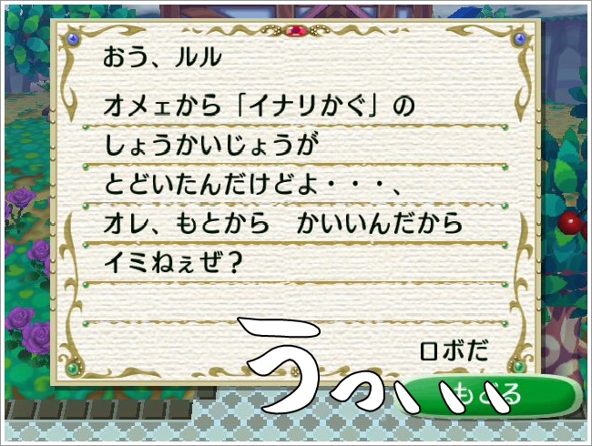 住人へ出したらどうなるんだろ?と、さっそくロボへ「しょうかいじょう」と書いた
